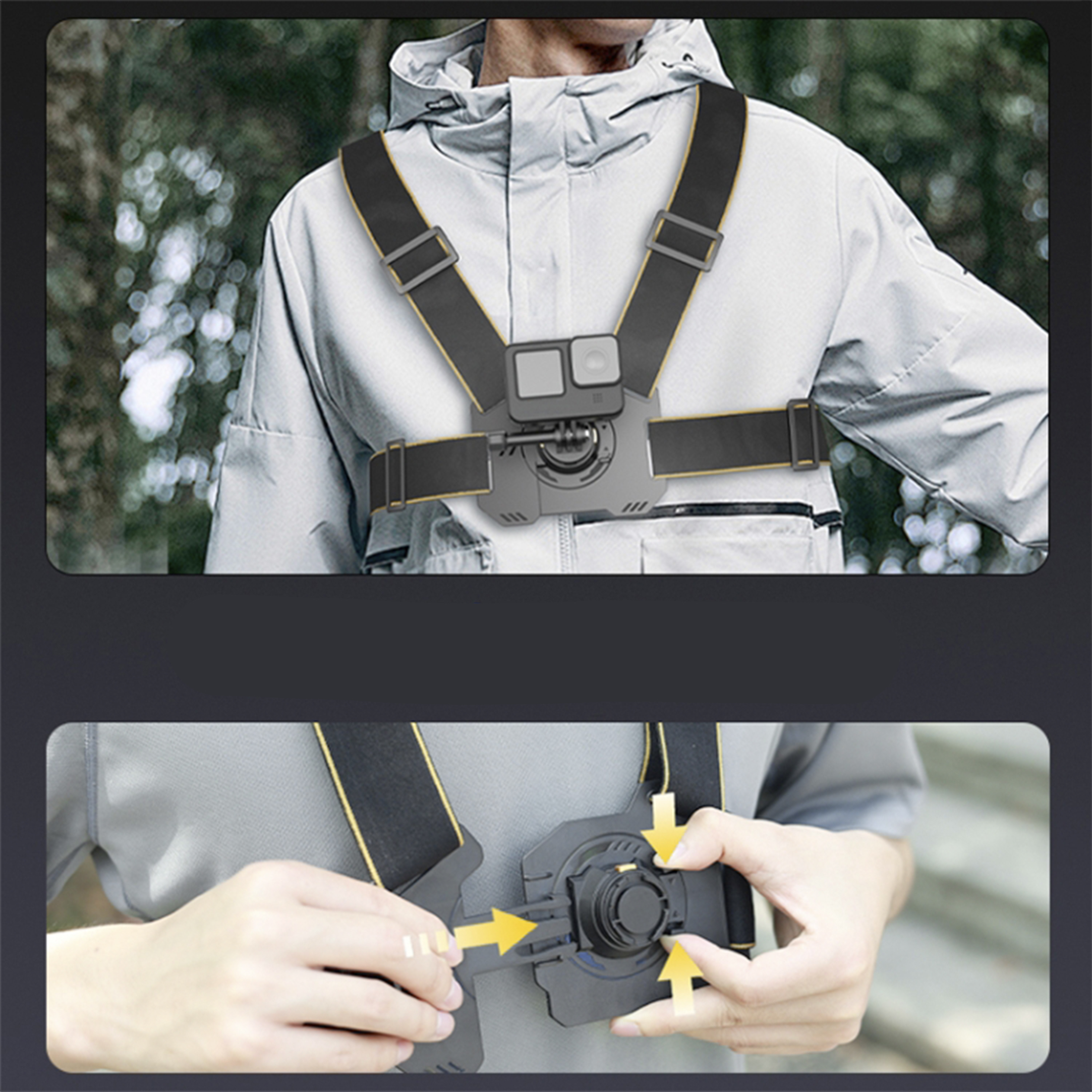 1. Этот нагрудный ремень обеспечивает захватывающую съёмку с видом от первого лица и оснащён устойчивой платформой для крепления экшн-камеры, которая идеально подходит для катания на лыжах, сноуборде, горных велосипедах, езды на велосипеде, каяках, рафтинге, сёрфинге, скалолазании и многом другом. Быстроразъёмная пряжка позволяет легко надевать нагрудный ремень, как жилет, и отправляться навстречу приключениям. Примечание: не используйте это изделие во время занятий скоростными или ударными видами спорта, чтобы избежать падений и повреждений.