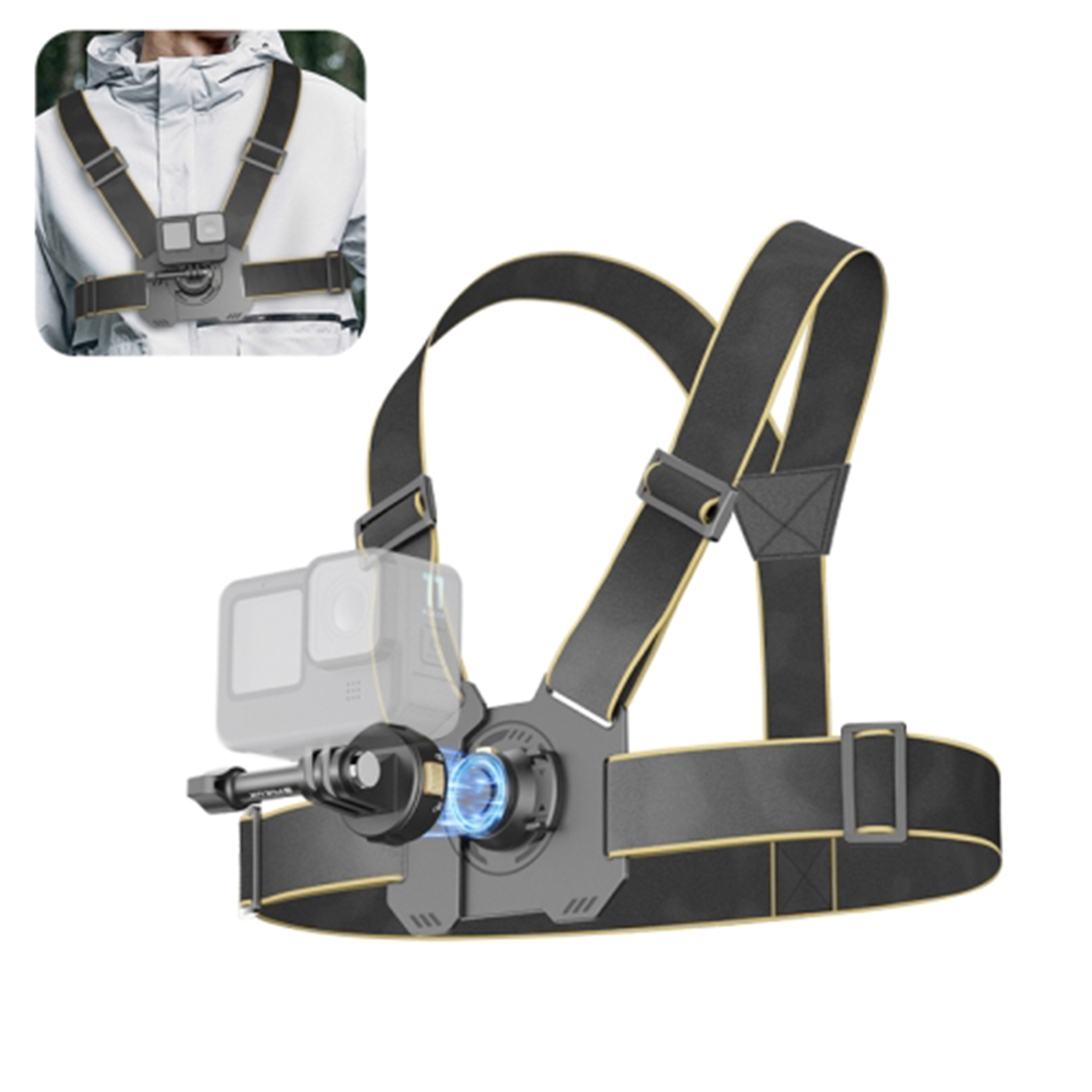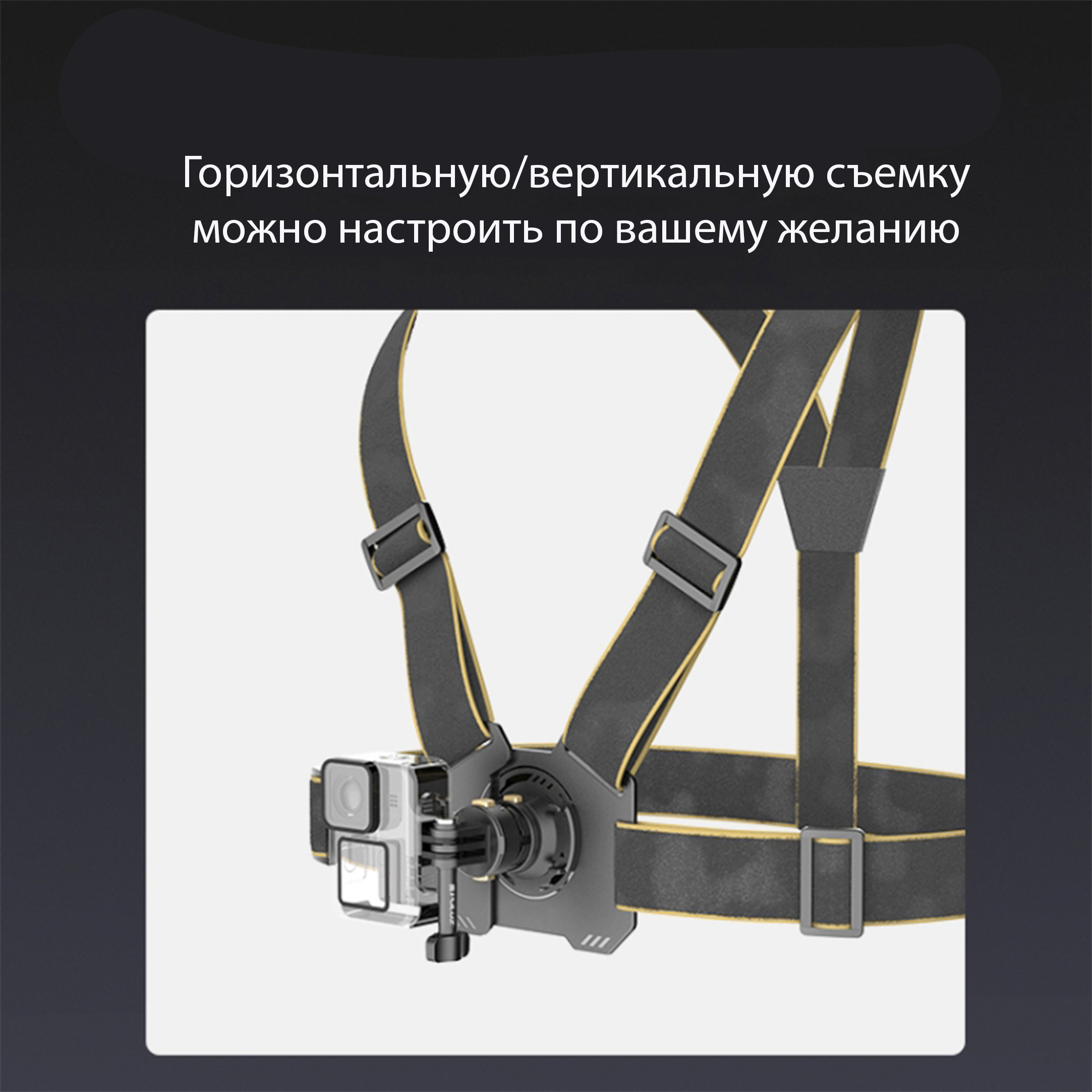 2. Нагрудный ремень изготовлен из дышащего и легкого материала, обеспечивающего максимальный комфорт и идеально подходящего для длительной видеосъемки. Эластичная лента и пряжка для регулировки размера позволяют ему подходить к различным формам тела.